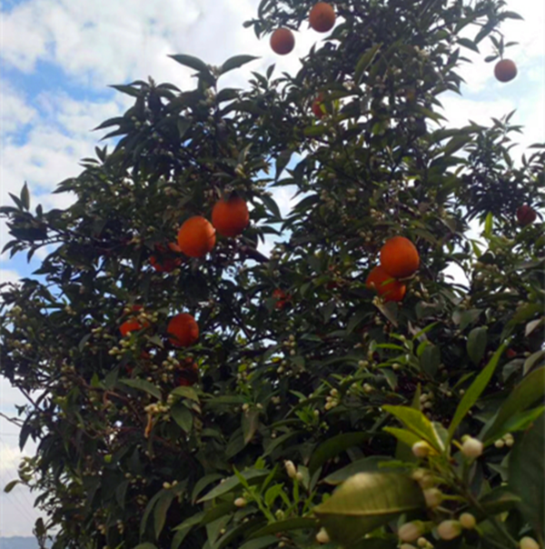 通过图片我们可以看到,这些春橙树的叶子绿油油的,整齐排列着,树上大大小小的橙子果,就像一盏盏的小灯笼,发出黄灿灿的光,再点缀一些零零散散的小花,真的是“秀色可餐”呀,但是为什么会出现一边开花一边结果的现象呢?确实是一个谜。