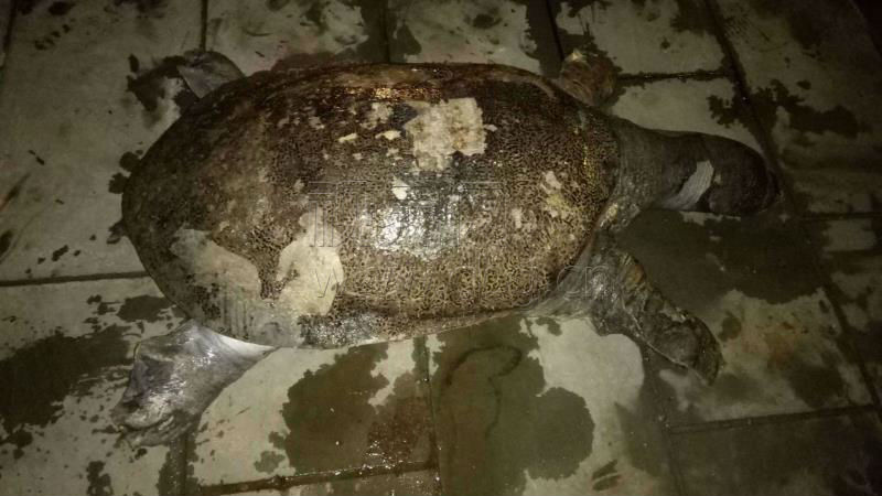 来自视界网的消息:昨天晚上,市民在合川嘉陵江南滨路上散步,发现岸边浮起来一不明物体,大家将其捞起来一看,好家伙,是一只巨无霸鳖,遗憾的是已经死亡。后经称重,重58.2斤。