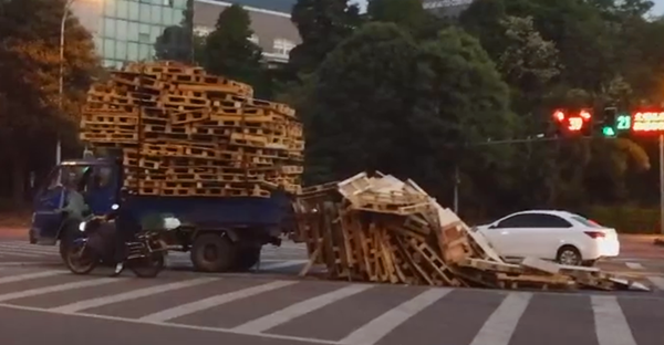 通过现场图片我们可以看到,货车货高和货长均超出原车一倍多,货物堆积如山,密密麻麻重重叠叠,即使地上掉了一大堆木箱后,车上还有如此多的木箱,这样高超的装载技术着实让人眼前一惊。