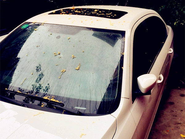 爱车遭遇“天降泡面” 面渣汤料铺满车身