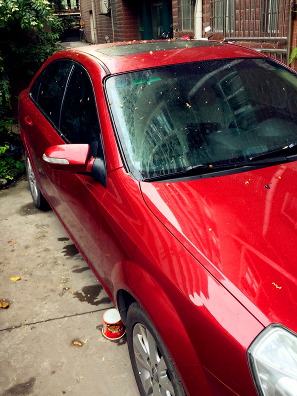 在白色小车一旁的红色小车,也好不到哪里去,几乎与白色小车的遭遇一样,从车顶到车头,都被方便面渣、面汤覆盖,水分干后,都成了污渍粘贴在车身表面,不免得也让人有点“恶心”。