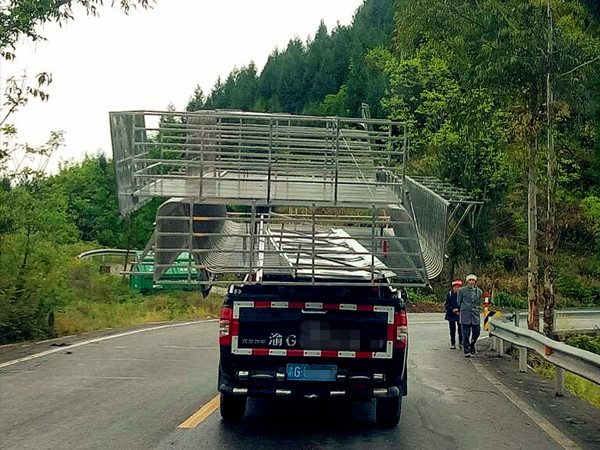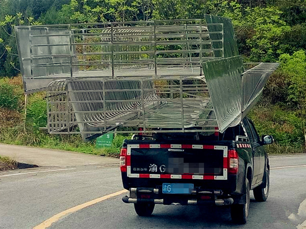 这几套防盗网装载在皮卡上,不仅超高看上去也超载了,虽然可能没有多重,但这很显然已经违反了相关规定。
