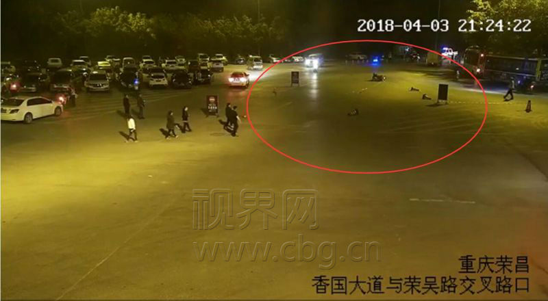 当晚9点左右,荣昌交巡警支队民警在荣昌区荣吴路口开展交通整治时,突然前方一辆搭乘2人的二轮摩托车快速冲过警戒带,并将路面上摆放的锥形桶绊倒后,连人带车摔倒在路上。