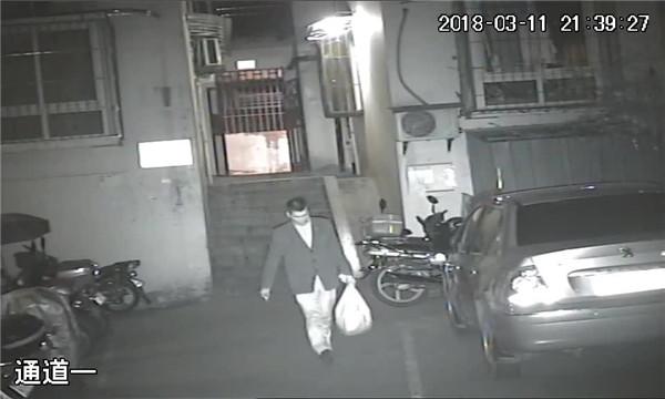 监控中犯罪嫌疑人手拧白色大蛇皮口袋