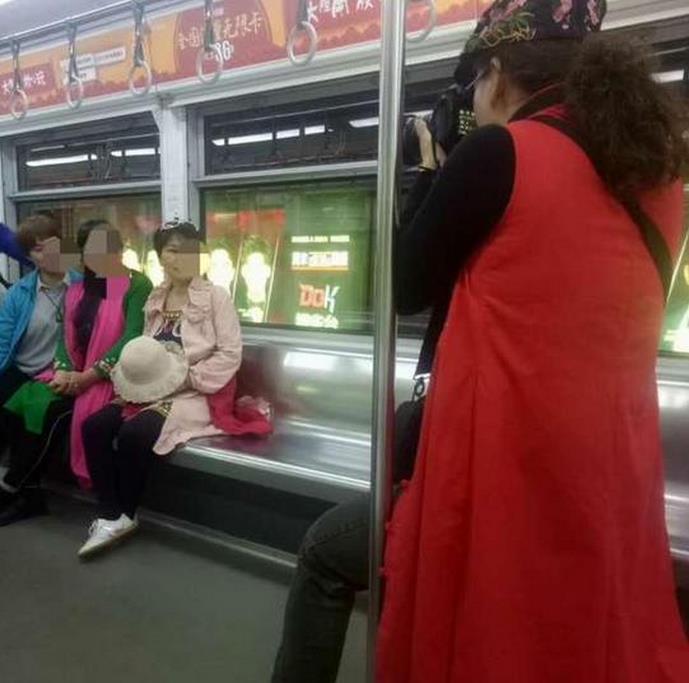 轻轨上游客阿姨身披丝巾拍美照引围观