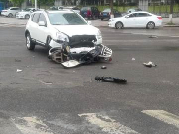 十字路口两车相撞 摩托车零件脱落