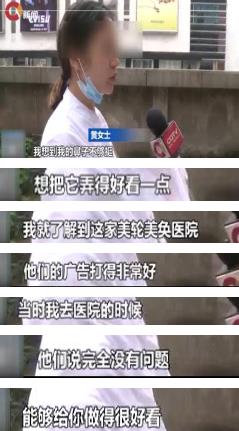 黄女士说,当时医生解释可能是手术还没恢复,让她等半年之后再修复。目前大半年的时间已经过去了,自己的鼻子看起来仍然很别扭。原本是想变漂亮,如今鼻子都歪了,黄女士我现在每天不敢出门,出门都是戴口罩,甚至有过轻生的念头。随后,记者和黄女士一起来到这家整形医院了解情况,医院的工作人员表示,整形手术存在一定的风险,黄女士的手术结果确实有些瑕疵。