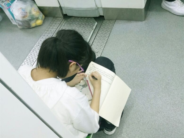 目击市民说,女孩走进车厢后,径直走到车厢连接处就蹲坐了下来。当时车厢内人比较多,有不少人往这里边看,女孩蹲坐在地上奋笔疾书,写起了作文。