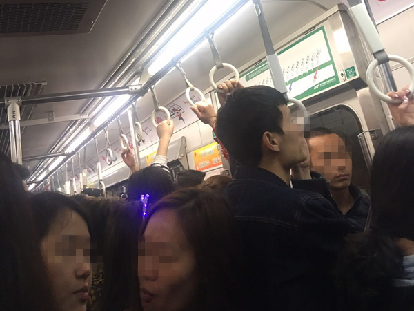 发布时间:2018-04-17 16:25:282018年4月14日晚上7点钟左右,市民张女士乘坐重庆轨道交通2号线到杨家坪,在大坪站,挤了两次才上了车。车厢内人山人海,张女士完全站不住脚,身体完全处于随车摇摆状态。突然张女士眼前一亮,看见不远处有一个多余的吊环,便机智的往里走。