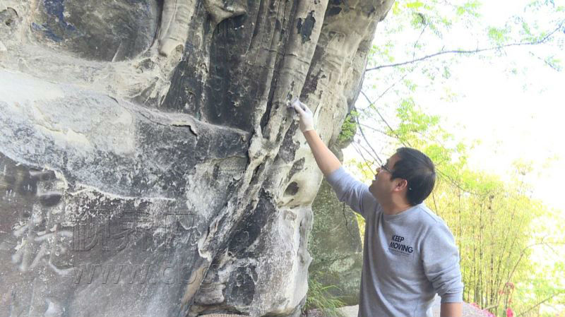据文保专家介绍,附着在石质文物表面的油烟,使原本色彩鲜艳的造像变得灰暗,严重掩盖了石刻的历史信息,也降低了文物的价值,对文物研究也造成了一定影响。所以清洗工作很有必要,但对于石刻文物的清洗,可不像清洗一般物件那么简单。据大足石刻研究院 监测中心副主任 赵岗告诉记者,根据大足石刻表面油烟污染物进行了初步研究,结果显示油烟污物中含有大量的炭黑、木材和植物纤维素热裂解产物及芳烃化合物。如果操作不当,会对文物产生二次破坏,因此我们在清洗材料和工艺的选择上就相当的慎重。