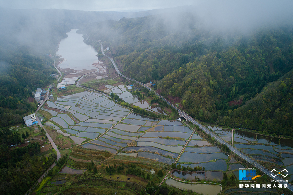 航拍重庆生态莼菜田点缀美丽乡村建设