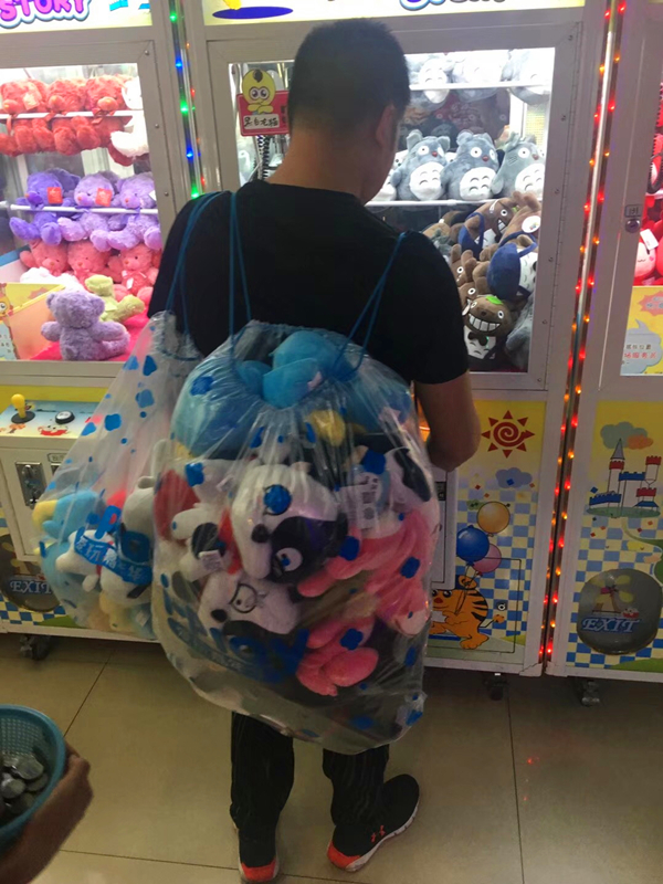 我伙呆!男子电玩城抓娃娃竟然抓了两大背包