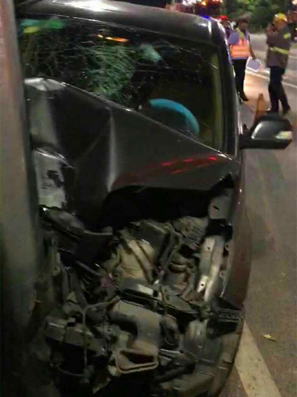 通过现场图片可以看到,私家车撞上了路边的电线杆,车头严重变形,前挡风玻璃也碎成了蜘蛛网。引擎盖被撞拱起,露出车头部位的配件、线路,周边满是被撞落的车壳零件,现场一片狼藉。