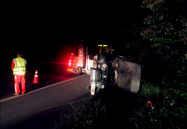 皮卡深夜高速上爆胎 180度旋转后侧翻路边