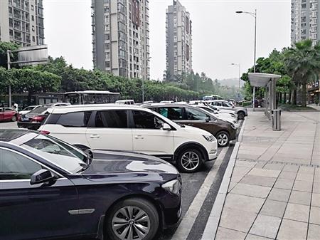 昨日,在渝北区新南路水晶郦城道路两旁的人行道上,树荫下成排停放着不少小车。“附近找不到位置了,我就在旁边的银行取个钱就马上走。”中午时分,道路两旁的人行道早已停满车辆,一辆黑车越野车主直接将车摆在了行车道上,后方来车只能刹车缓慢让行通过。