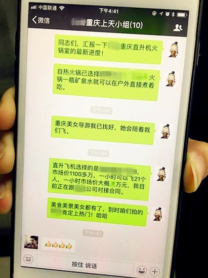 吃着自热火锅、坐着直升机、在美女导游的讲解下,一站式感受重庆美食美景美女三张城市名片。这不是哪个旅行社的新产品,而是一群来自全国各地的网友,在重庆旅游的疯狂计划。近日,一张微信截图引起了很多重庆大V的转发,据悉,10名网友正计划在重庆预定一架1100万元的直升机,要在飞机上吃火锅看美景。记者获悉,他们费尽周折做这一切的初衷,竟然只是为了在网红城市重庆拍小视频,获得别人的点赞。