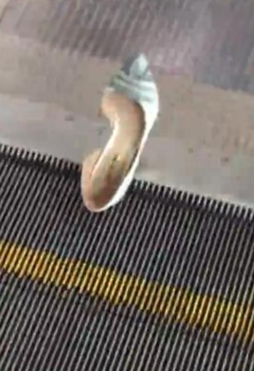这位女士走着走着,突然一只鞋卡在电梯缝隙里,电梯一直在运行,也不好马上去扯出来,再加上这样也引起其他乘客乘坐电梯通行,只好面带尴尬的笑容,光着一只脚无奈的站在一边。