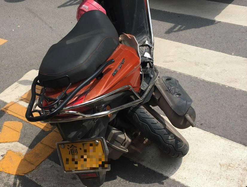 从现场图片可以看到,这辆出租车停靠在人行道上,而摩托车被撞飞后,侧着身子停在人行道一侧,摩托车车尾受损,后车轮严重扭曲。