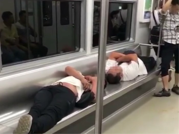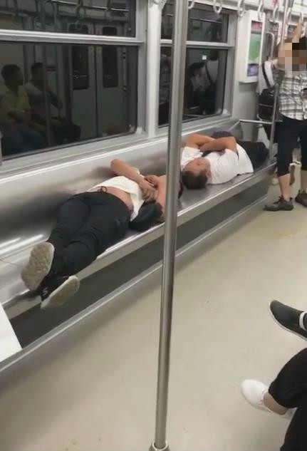 发布时间:2018-06-05 16:08:17近日,有网友爆料,乘坐轨道交通2号线出行时,在车厢内看到这样一幕,两位男子竖躺在座椅上呼呼大睡。