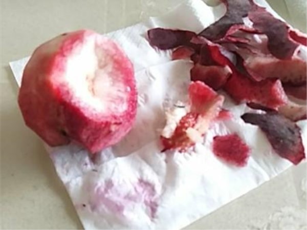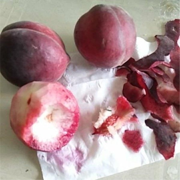 桃子表面有一层薄薄的毛,食用之前需洗净并用小刀消除干净,可以明显的看到削皮后的桃子,放在卫生纸上竟变成了紫色,和平常大家看到的桃子颜色完全不同。