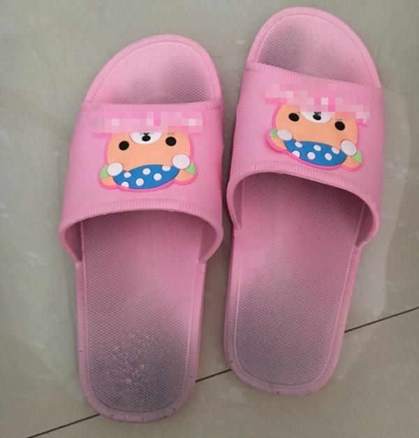 这双粉色的拖鞋,上面还印有一个呆萌熊的图案,看上去可爱极了。拖鞋的底部,根据脚踩的地方不同,颜色逐渐加深变黑,尤其是脚底,踩的部分最为明显。