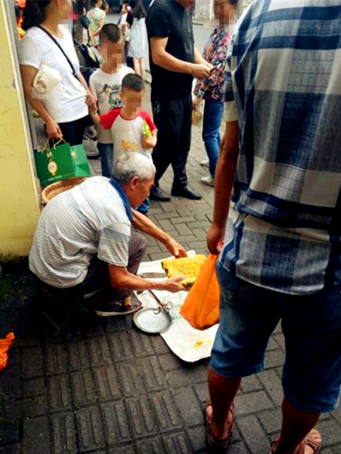 男子街头卖“崖峰糖” 路人怀疑“这是骗人的”