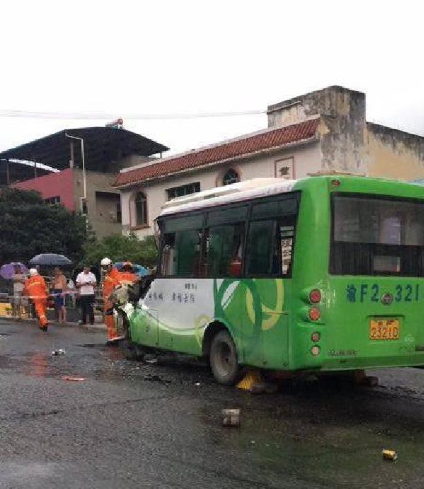 2018年7月12日,重庆云阳。有市民在莲花看见,一辆小巴士与大货车相撞,车头毁损严重,驾驶室一侧的挡风玻璃已经破裂。