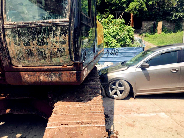 挖掘机作业时与小轿车相撞 现场略显尴尬