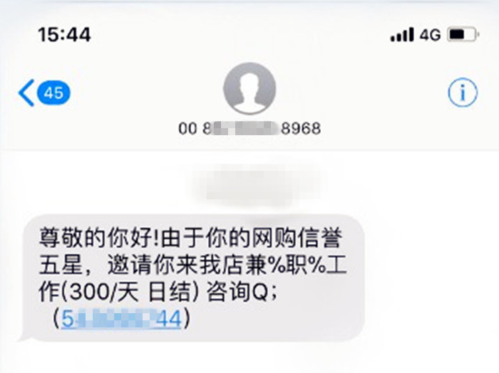 近日,家住九龙坡区谢家湾的柏女士手机收到陌生号码发来的短信:“由于网购信誉五星,邀请来店做兼职,日赚300元”。足不出门就能轻松赚钱?