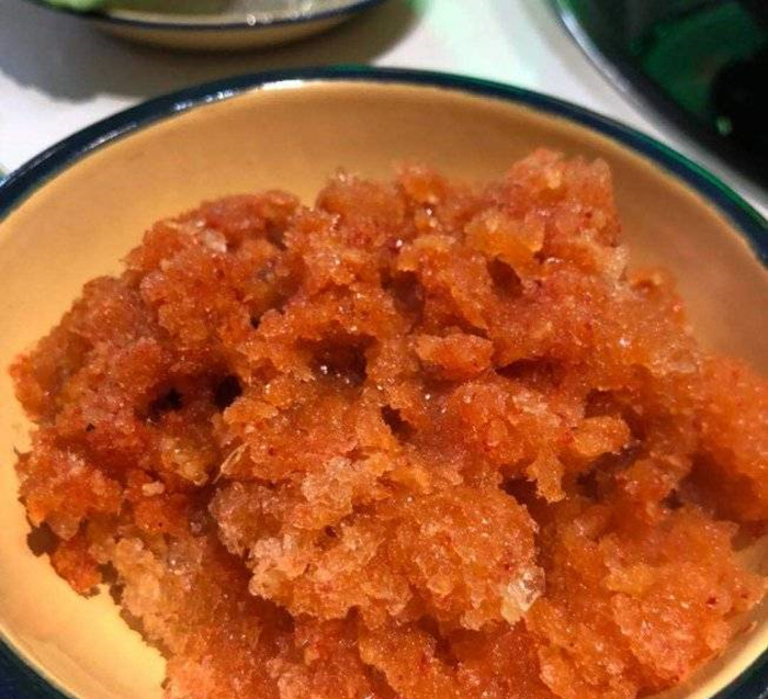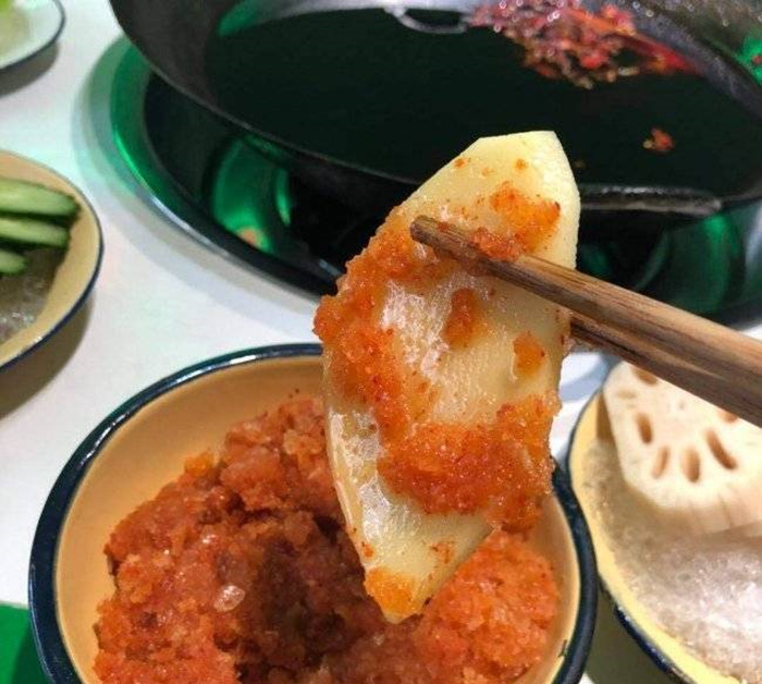 从爆料网友提供的照片上可以看到,味碟里是细密的碎冰,看上去很解暑,加上红色的辣椒,瞬间又有了吃火锅的气氛。大块的土豆片混着绵软的细冰,看上去非常有食欲。