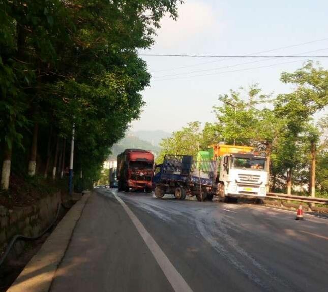 通过现场图片可以看到,两辆事故车的后方已经有车辆积压,出现缓堵。现场还散落着一些车身碎片,红色大货车驾驶室的挡风玻璃已经全部碎裂。
