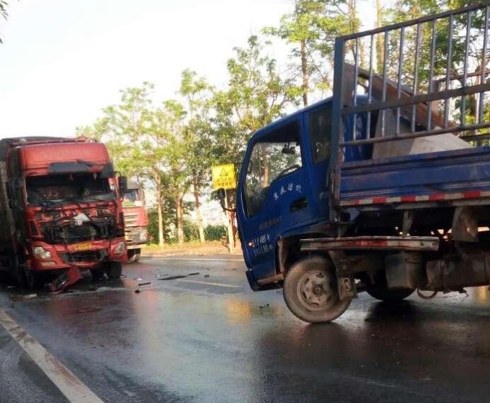 两车猛烈相撞当街“亲吻” 大货车车头受损严重
