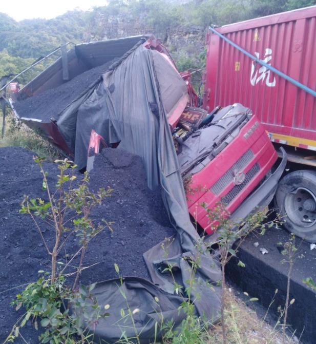 通过现场图片可以看到,煤车被大货车挤倒在路边呈倾斜状态,装载的煤大量洒出,驾驶室几乎都没了。