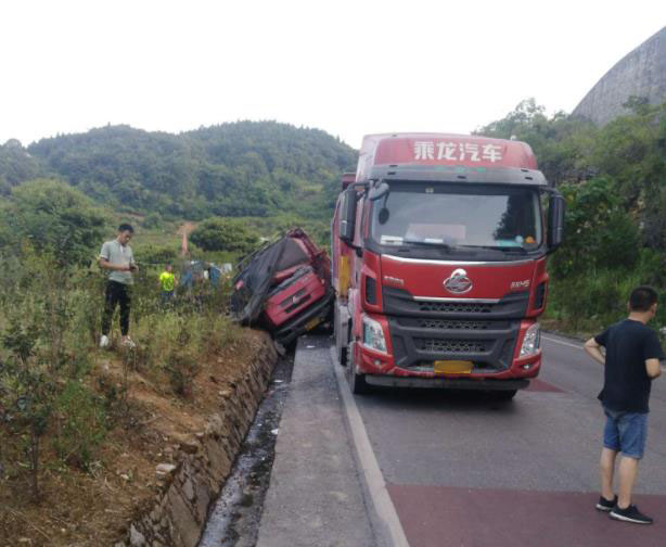 有网友爆料,8月18日,重庆綦江区打通镇附近路段,一辆大货车为了让对面来车,将后方的煤车撞倒,致使煤车里的煤大量洒出,驾驶室遭到严重破坏,挡风玻璃被撞碎,驾驶室内一片狼藉。