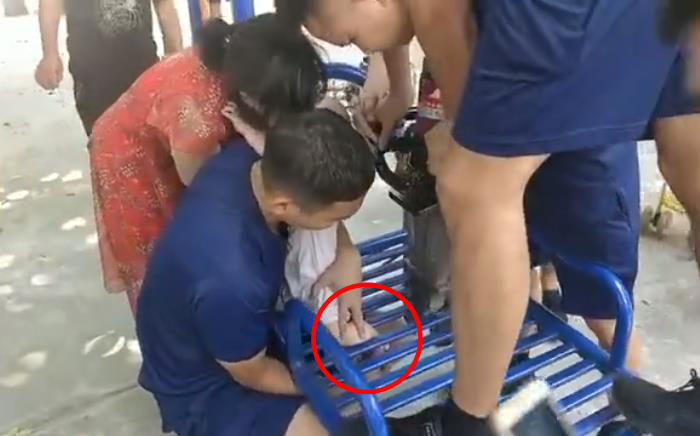 幼童左脚不慎卡在小区健身器材上 疼得哇哇大哭