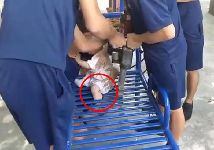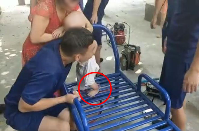 消防人员赶到现场后,孩子疼得哇哇大哭,家长抱着孩子心急如焚。孩子家长称:当时她抱着孩子站在这个健身器材上玩耍,没想到孩子左脚踩滑,滑进了器材两根铁条之间的缝隙里被死死卡住。