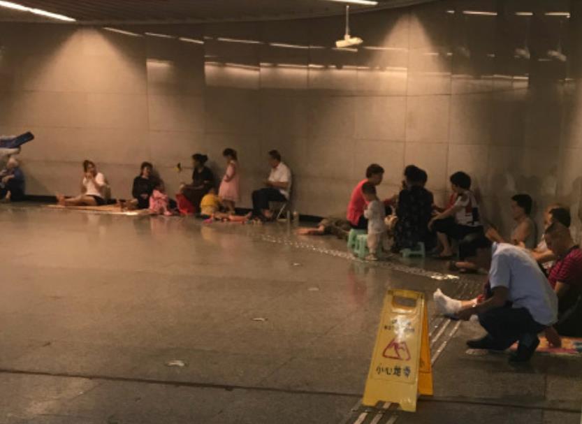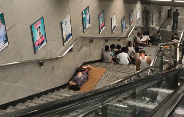 大妈轨交站内自带凉席 赤脚靠墙睡觉