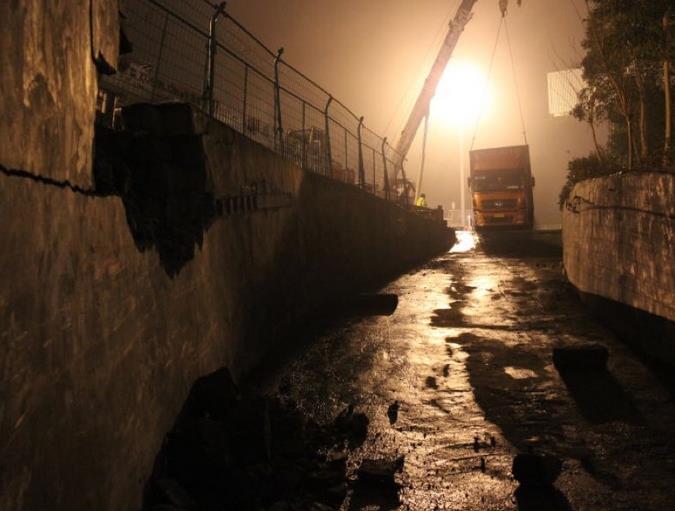 记者从重庆高速执法三支四大队了解到,12日晚9点过,执法人员接到报警称酉阳服务区发生了一起事故,车辆被困,无人员受伤。执法人员赶到现场发现一辆六轴集装箱车被困服务区下穿道,驾驶员在一旁束手无策满脸无奈。执法人员一边对服务区内相应区域进行管制组织开展救援,一边向驾驶员询问了事故经过。