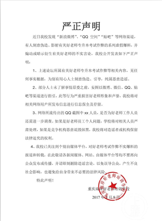 针对网友爆料和考生们热议,重庆南岸好老师培训学校在4月9日下午发布了一则“严正声明”。该校在声明中提到,“有人刻意伪造、影射有关好老师专升本考试作弊的系列虚假爆料,并煽动或暗示衍生有关好老师的不实言论。”