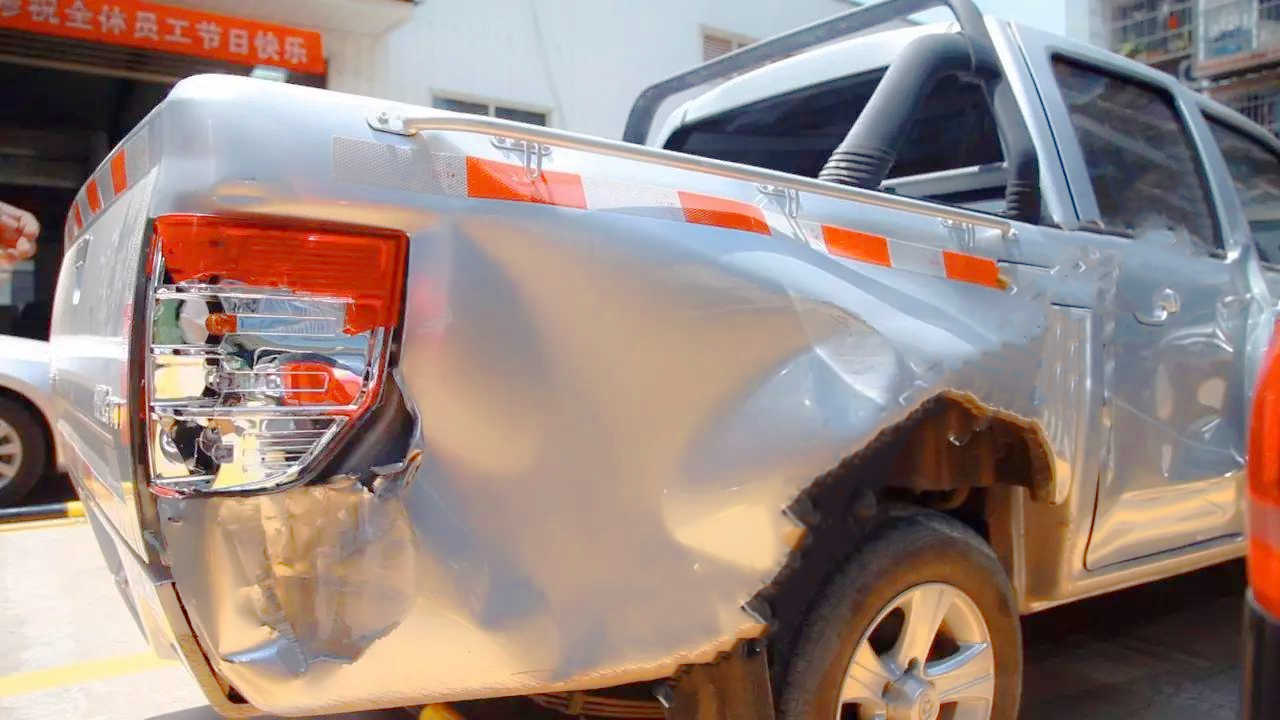 罗先生:“我在等红绿灯,一辆大巴突然从我右后侧冲了出来,把右后侧的车门撞坏了,还有车后侧方也撞变形了”
