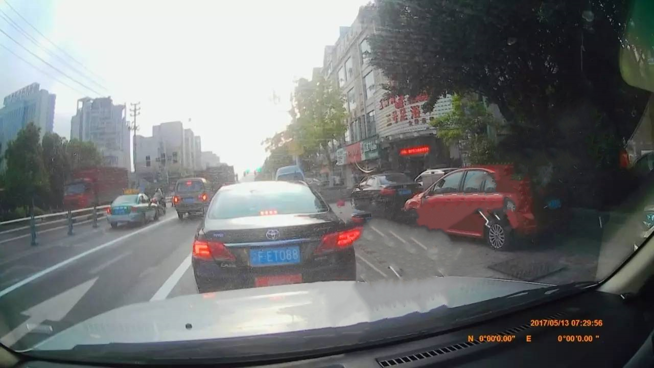 从行车记录仪上可以看到,肇事车速度很快,横冲直撞,最终撞在电线杆上才停了下来。而电线杆上的路灯被震动下来,又砸在一辆婚车的前挡风玻璃和引擎盖上面。