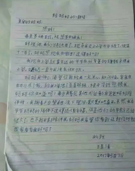 网友补充:孩子的爸爸一直在外地做苦工 ,过年他们还是在一起,至于他妈妈就不知道去哪里了,孩子可能是想他妈妈了才写的这封信!