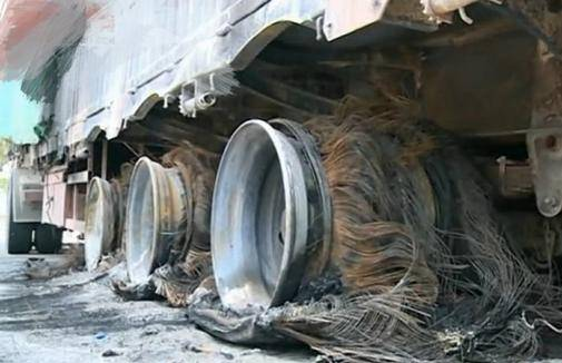 大货车司机说,可能是由于自己转弯时,轮胎擦到了路边的护栏,所以才导致轮胎起火燃烧。车上的货物也被烧了,12个轮胎更是被烧成灰烬,司机很庆幸自己发现及时,继续行走的话可能自己也会受伤。