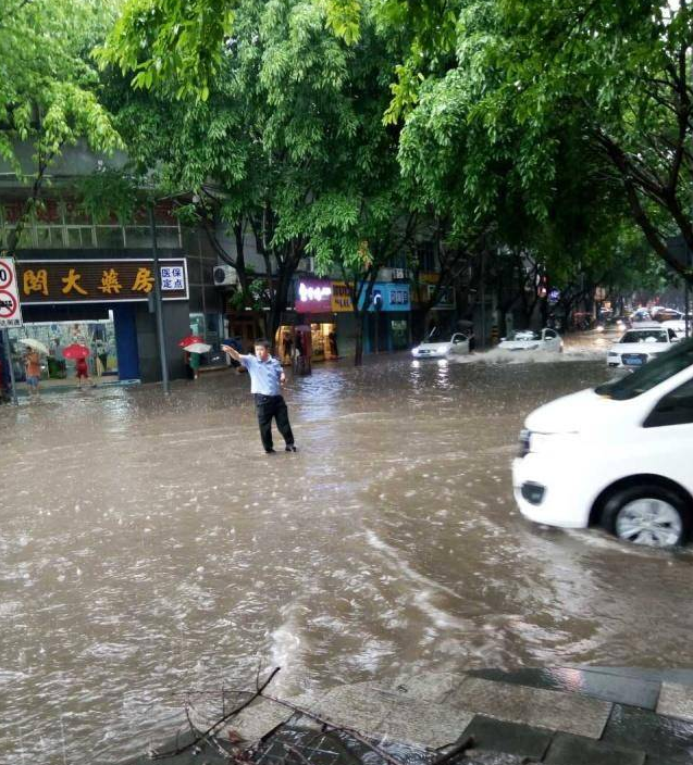 想到这里,戈杨淞顾不上拿伞也顾不得穿雨衣,跳下车就站在水中开始指挥疏导。一边引导过路车辆避开积水的沿河路、从桥上绕行,一边联系指挥室让路边的车辆开走以免被淹,同时还联系市政部门到现场进行疏通处理。