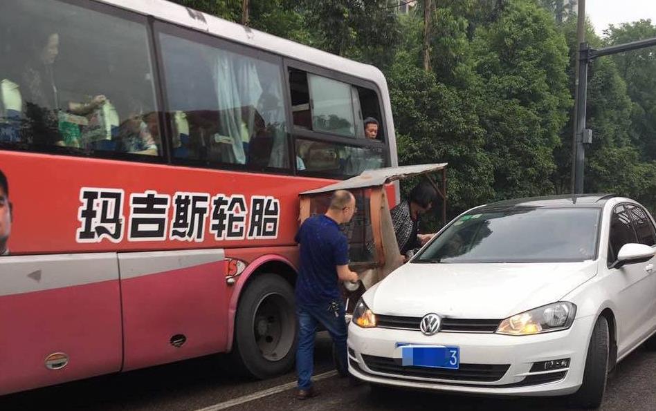 三轮车上的女司机夹在中间进退两难,被卡得出不来,小轿车右侧的后视镜直接被刮掉了。眼见爱车受损,小车司机别无他法,只能自己慢慢往后倒车,先让女司机出来,也避免自己的车遭受更大损害。