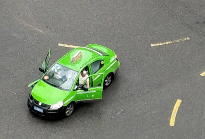 由于担心有人受伤,目击者跑到楼下去仔细看了看事故现场。从现场看到,撞击力度不小,出租车的灯都被撞掉,就剩个空洞洞的“眼睛”。