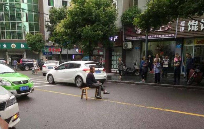 6月14号下午,重庆璧山区璧城街道中山北路,两边车辆来来往往,一位大哥搬根板凳,翘着二郎腿,坐在马路中间岿然不动,一副气定神闲的样子。