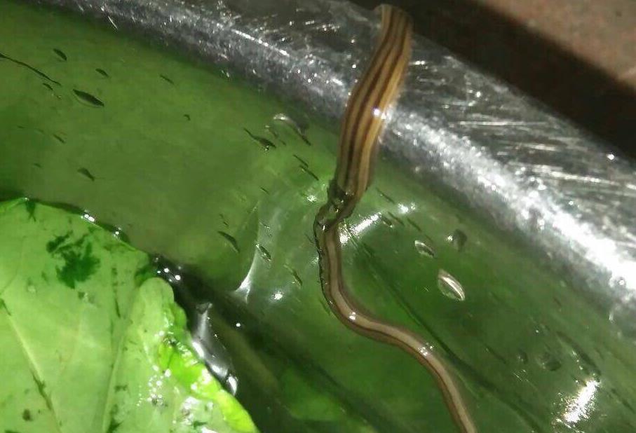 6月16日晚,家住璧山的何女士正在做晚饭,她拿出前天买来的青菜放进水盆里浸泡,打算过会儿来清洗,一转身发现水盆边上爬出来一不知名生物。虫子细细扁扁的,蠕动到水盆下方,看起来至少有30公分长,躯干上有黑色条纹。她看过来看过去,也不知道这到底是个什么虫,只好收拾收拾,扔进垃圾桶里。