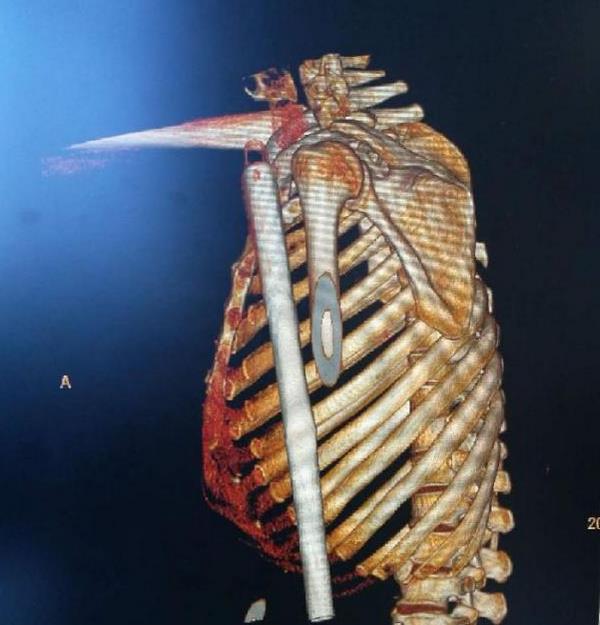 检查发现病人体内的异物长达15厘米,“他算是幸运的,这个管子插入的位置很微妙,正好插在胸大肌和胸小肌之间,管子插入深一点伤及锁骨下动静脉或者穿刺到颈部,将造成大出血,管子往里一点进入胸腔,对心脏和肺的伤害,这些都有生命危险。”罗主任说。