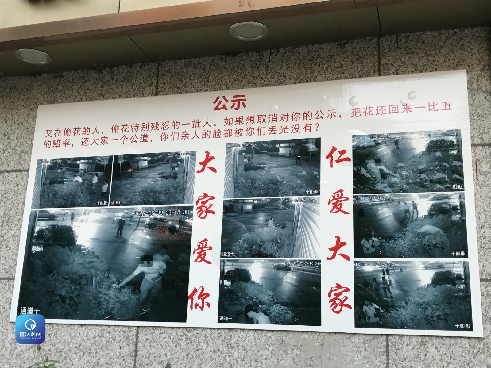 公示上是监控调出来的几处画面,画面中的男男女女正在偷花。该公示表示如果想取消对偷花人的公示,需要偷花人把花还回来。